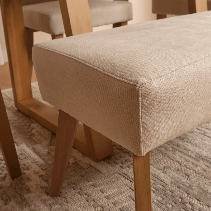 Mesa de comedor con 3 sillas de comedor y una banca, cama doble y una mesa de noche, piezas que se adaptan fácilmente a espacios pequeños sin perder elegancia.