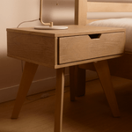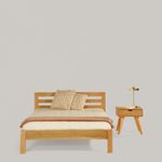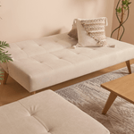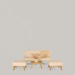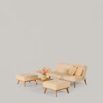 sofácama, dos puff, mesa de centro, cama doble y mesa de noche, piezas que se adaptan fácilmente a espacios pequeños sin perder elegancia.